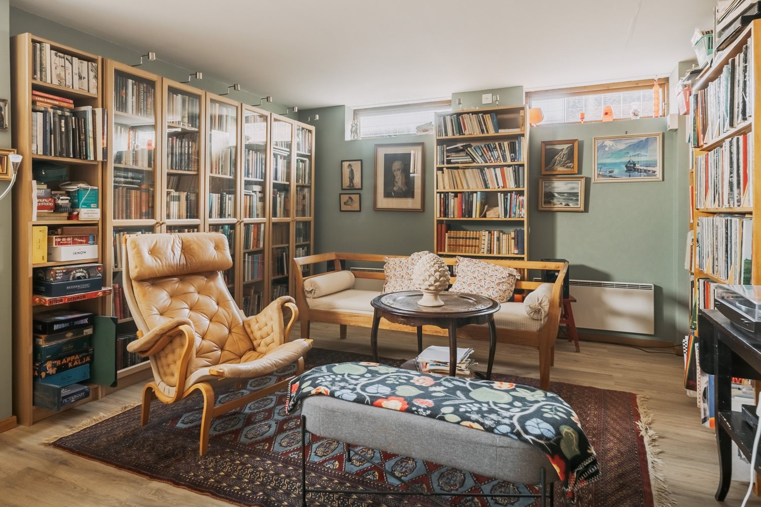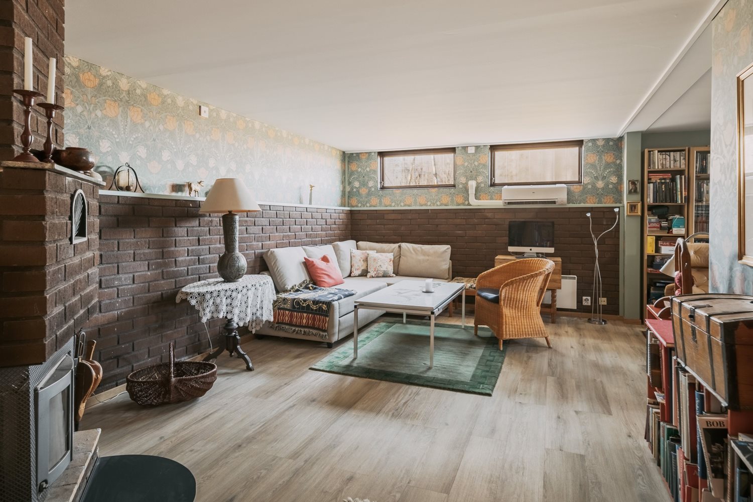 Ett gediget och trivsamt allrum i källaren, som renoverades 2022, med en luftig och inbjudande känsla. Tack vare källarfönstren får rummet fint ljusinsläpp, vilket skapar en ljus och trivsam atmosfär trots läget under marknivå.