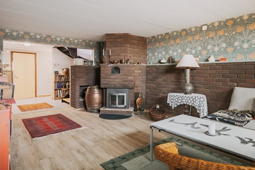 Här finns en mysig eldstad som blir en naturlig samlingspunkt, och gott om plats för en stor soffgrupp – perfekt för filmkvällar, spel eller avkoppling med familj och vänner. Ett varmt och välkomnande rum som blir hemmets naturliga mötesplats även på nedre plan. Här ligger ett ljust laminatgolv 2022.