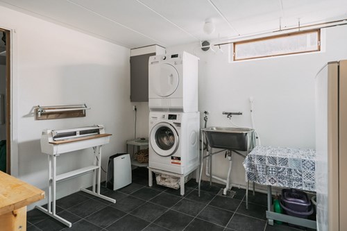 Större tvättstuga med ljusinsläpp från källarfönster. Här ligger klinker på golvet och rummet känns fräscht och rymligt. Här finns tvättmaskin, torktumlare, tvättho, mangel och ett förråd med frysbox.