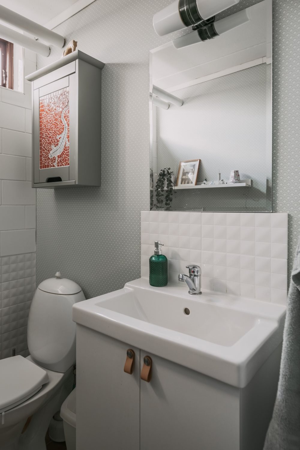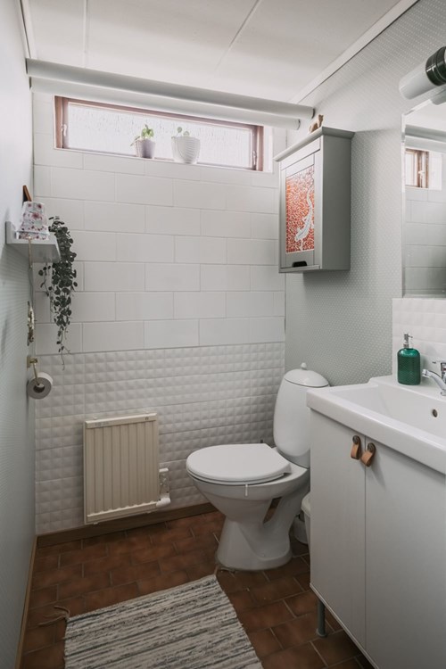Mindre toalett med klinkergolv och tapetserade/kakel väggar från 2022. Här finns dagsljus från ett källarfönster, wc-stol, tvättställskommod och spegel.