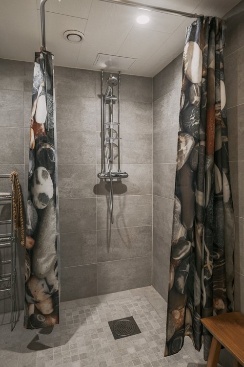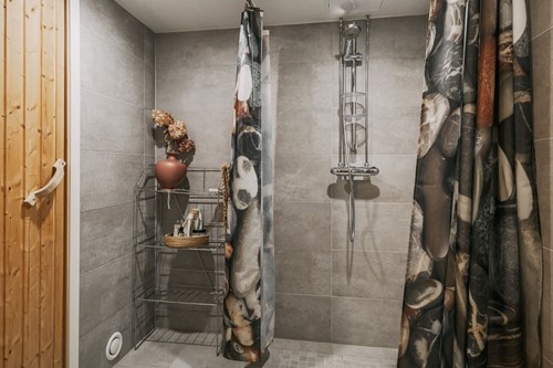I källaren finns en trivsam bastu och dusch med intilliggande relaxrum – en perfekt plats för avkoppling och återhämtning. Bastun erbjuder en lugn oas efter en lång dag. Både bastu och duschrum är nytt från golv till tak och renoverades 2022. Duschavdelningen är klädd med kakel på väggarna och klinker på golvet i bastu och duschrum.