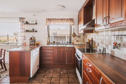 Detta är ett välplanerat arbetskök med generösa arbetsytor och en underbar utsikt som gör vardagen lite extra njutbar. Här lagar du mat med sjön som kuliss och ljuset som sällskap.